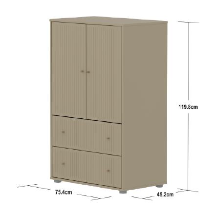Der FLEXA SAGA Schrank verfügt über zwei Türen zwei Schubladen und einen verstellbaren Einlegeboden. Die Türen mit Soft Close Funktion und die Schubladen schützen kleine Finger und bieten eine elegante und leise Schließfunktion. Die runden Metallgriffe in der Farbe Oat sowie die gerillten Details an den Türen verleihen dem Schrank ein schlichtes und elegantes Design.