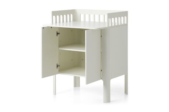 Dank der großen Oberfläche haben Sie die Wickelauflage und alles wichtige Zubehör wie Windeln, Feuchttücher und Kleidung in Reichweite. Direkt unter dem Wickelaufsatz finden Sie ein geräumiges Schrankelement mit höhenverstellbarem Regalboden und handlichen Push-to-Open-Türen.