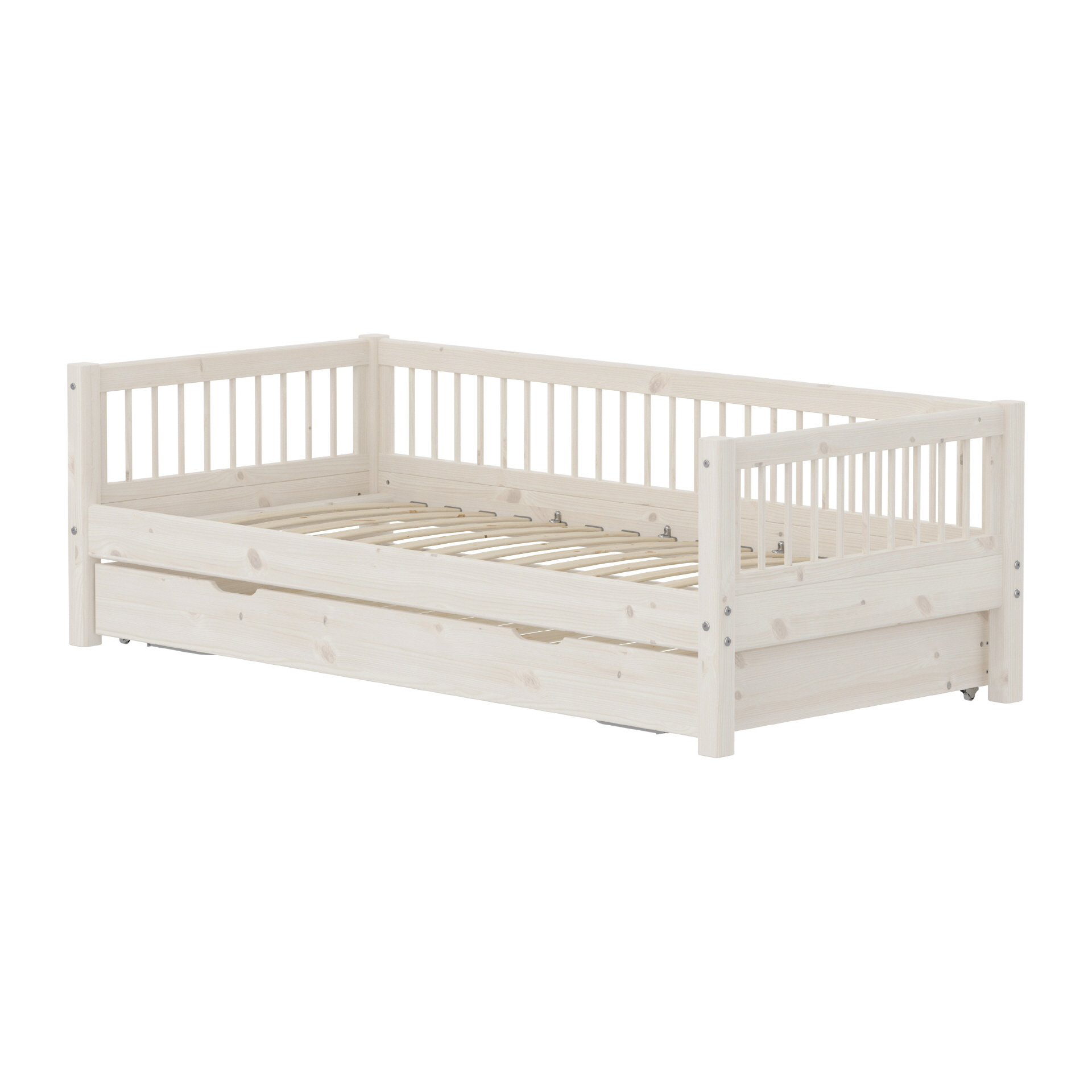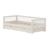 CLASSIC Daybed mit Rückenlehne, Kopf- und Fußteil mit Kreuzleisten und Ausziehbett unter dem Bett. Das Bett ist ideal für Teenager und Übernachtungen mit Freunden oder Familie. Das Bett ist in White Washed Kiefernholz erhältlich.