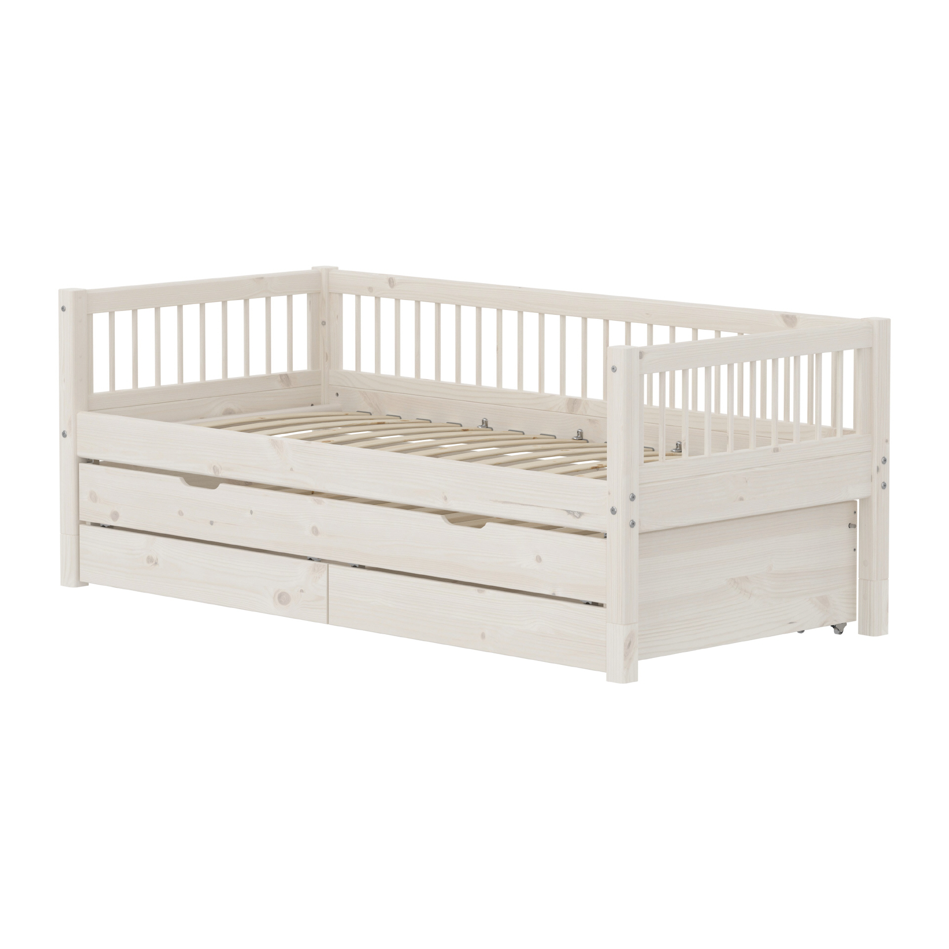 CLASSIC Einzelbett mit Rückenlehne, Kopf- und Fußteil mit Kreuzleisten. Das Bett wird mit 2 Schubladen und einem Ausziehbett unter dem Bett geliefert. Ideal für Teenager und Übernachtungen mit Freunden oder der Familie. Das Bett ist in White Washed Kiefernholz erhältlich.