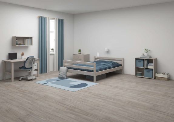 140 cm-Bett mit integriertem Lattenrost.