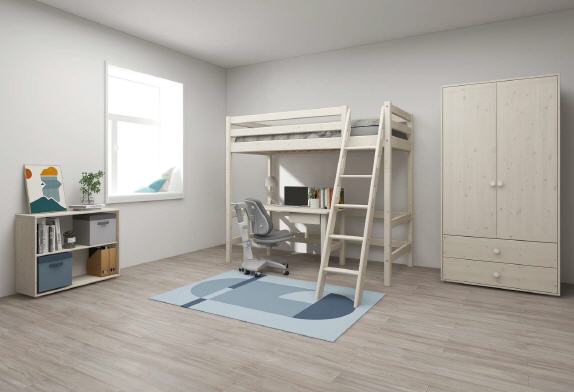 Hochbett Classic mit neuer Schrägleiter mit integrierten Griffen. H:185 L:210 B:179 cm