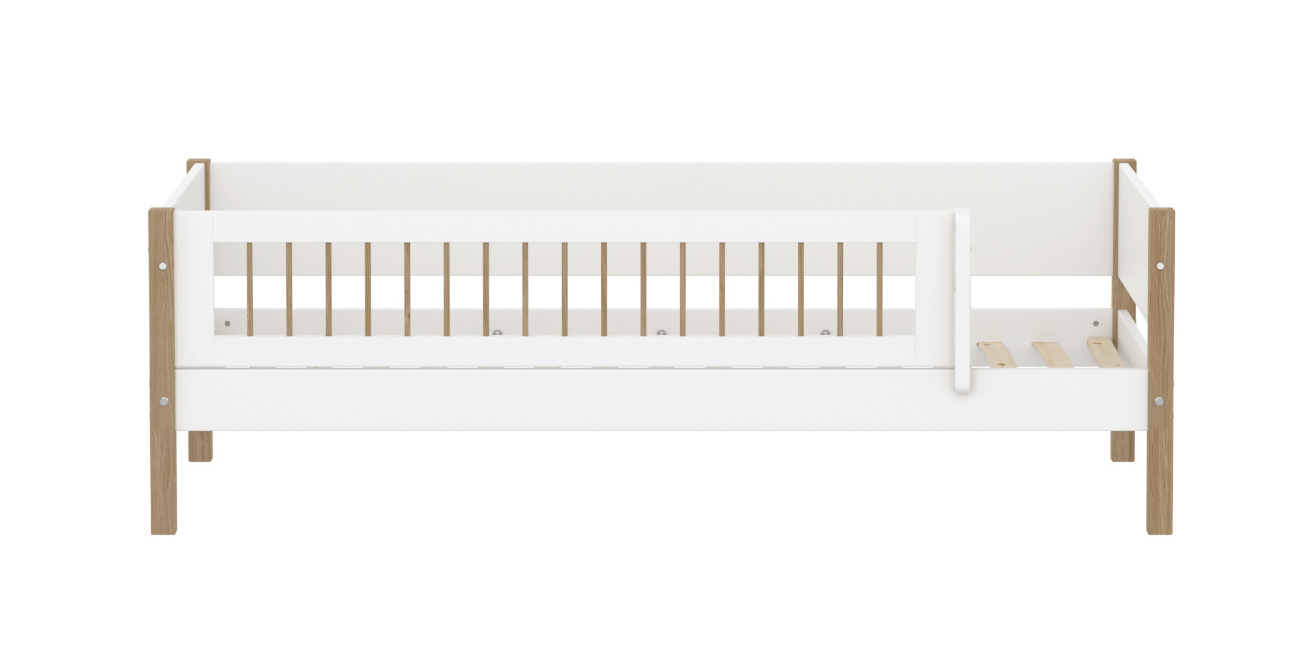 Das weiße, zeitlose NOR Einzelbett mit Absturzsicherung verleiht dem Kinderzimmer eine ruhige und nordische Atmosphäre.