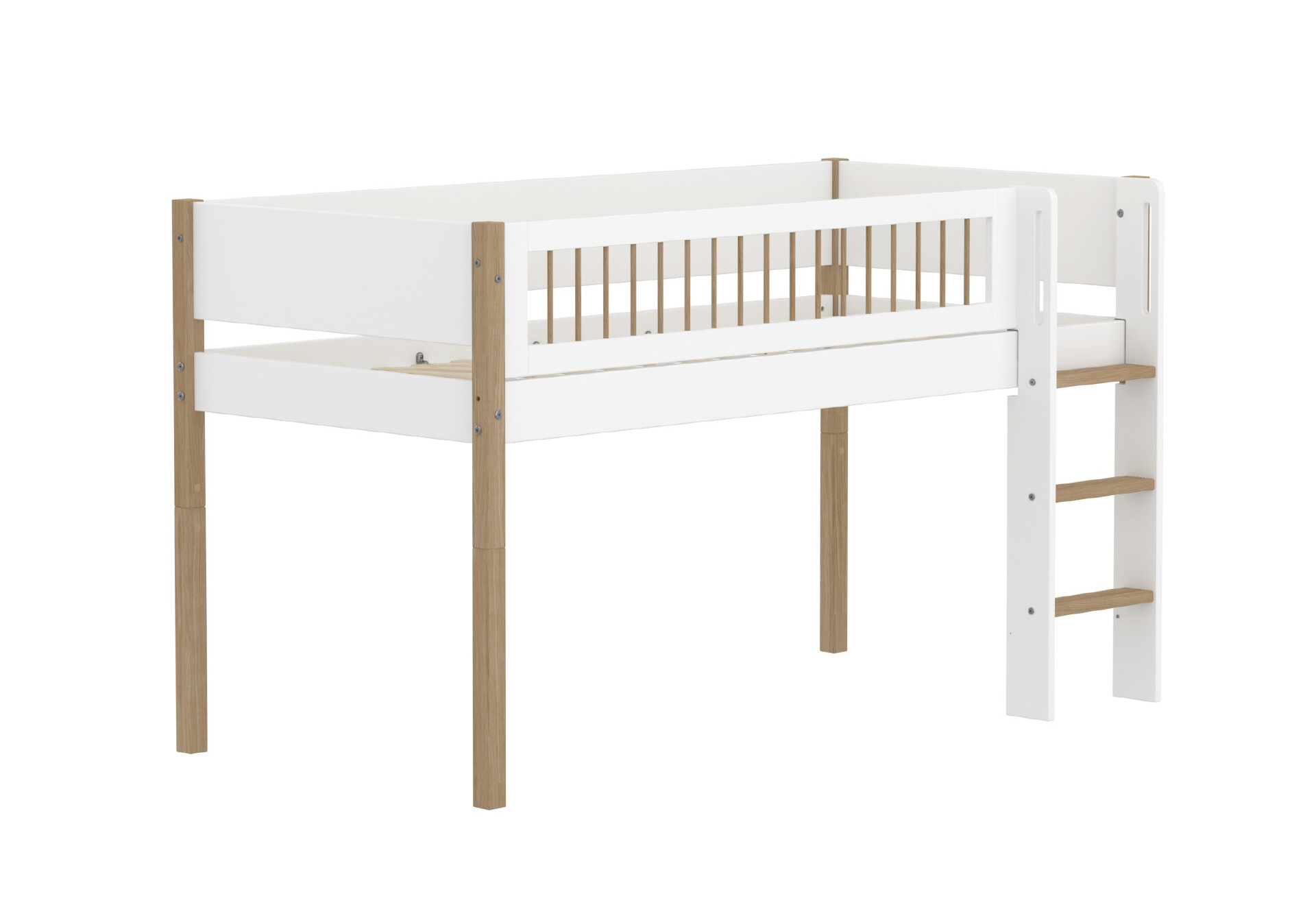 Halbhohes NOR Bett mit gerader Leiter und Absturzsicherung, Die Leiter hat rutschfeste Stufen und integrierte Griffe und kann an beiden Bettenden aufgestellt werden. Der Raum unter dem halbhohen Bett eignet sich ideal als Stauraum.