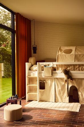 Die NOR Kollektion wächst mit dem Kind. Wenn Sie kurze Pfosten an das halbhohe Bett montieren, wird daraus ein Einzelbett. Wenn Sie lange Pfosten an das Bett montieren, wird daraus ein Hochbett.