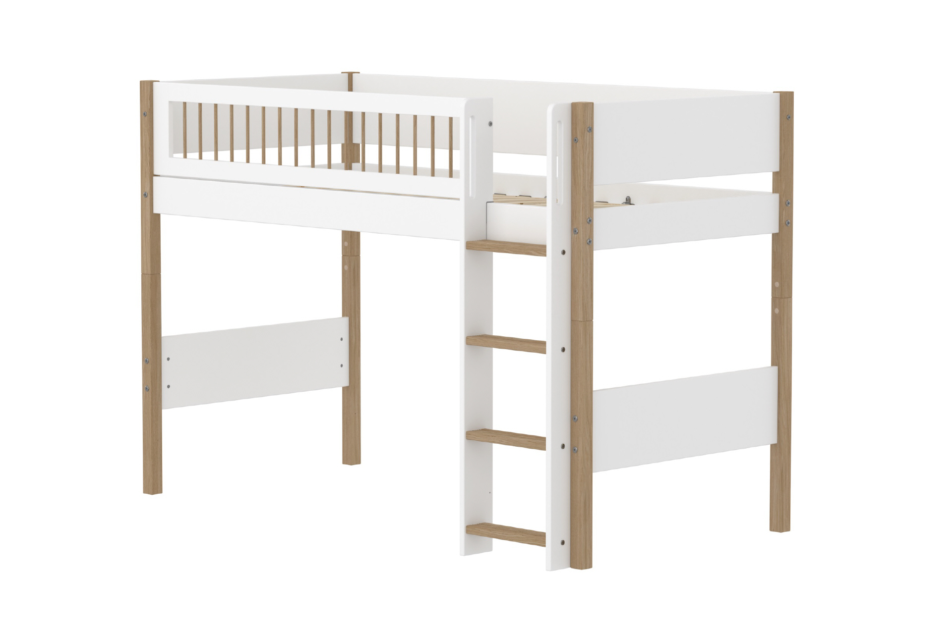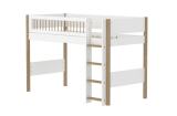 Mittelhohes NOR Bett mit gerader Leiter für größere Kinder. Die Leiter hat rutschfeste Stufen und integrierte Griffe und kann an beiden Bettenden aufgestellt werden.