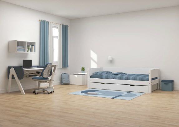 White MDF Einzelbett mit Ausziehbett und Pfosten aus Birke, weiss/weiss.