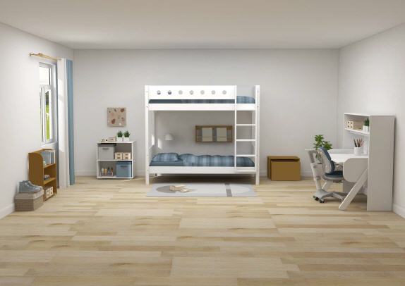White MDF Etagenbett extrahoch mit farbiger Absturzsicherung und Pfosten aus Birke, weiss/weiss/weiss.