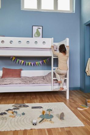 White MDF Etagenbett mit farbiger Absturzsicherung und Pfosten aus Birke, weiss/weiss/weiss.