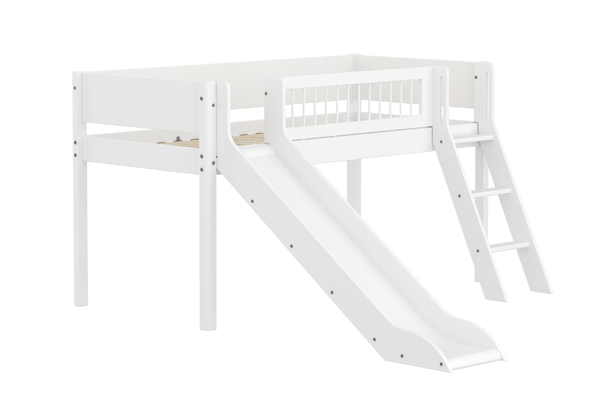 Halbhohes White Bett mit Schrägleiter und Rutsche. Das Bett, das ein Kinderzimmer in einen Spielplatz verwandelt!