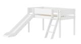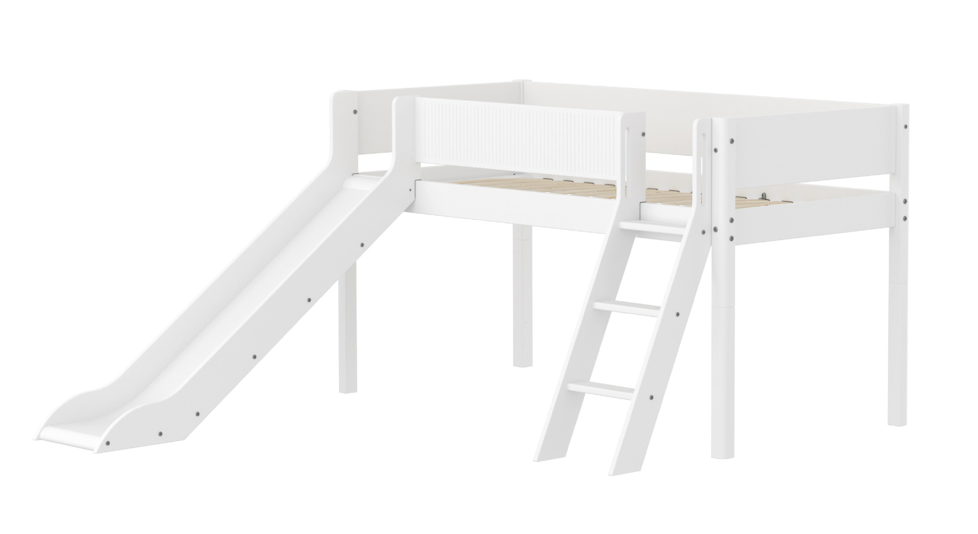 Halbhohes WHITE Bett mit Schrägleiter und Rutsche. Das Bett, das ein Kinderzimmer in einen Spielplatz verwandelt!