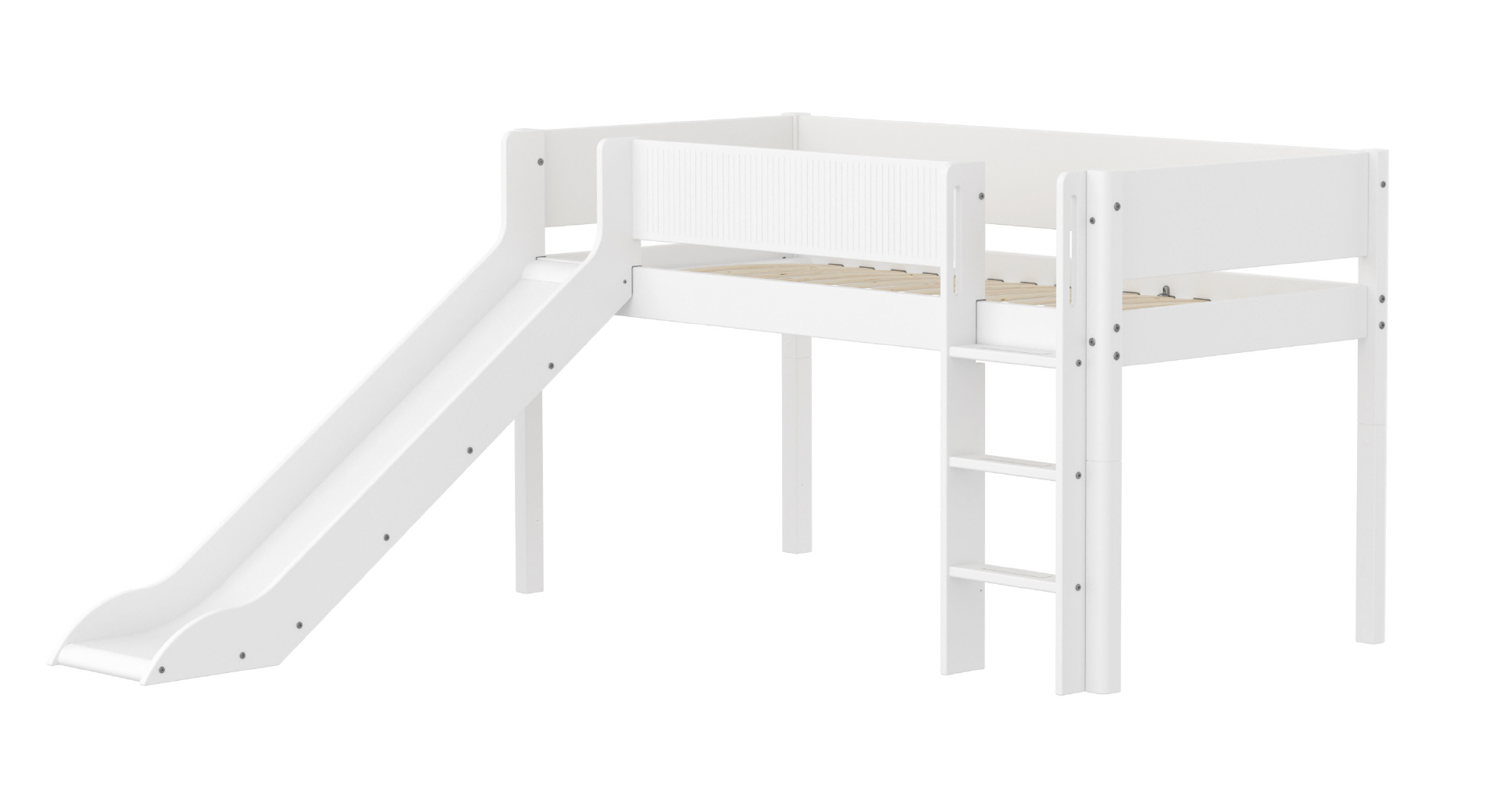 Halbhohes WHITE Bett mit Schrägleiter und Rutsche. Das Bett, das ein Kinderzimmer in einen Spielplatz verwandelt!