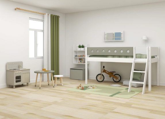 White MDF halbhohes Bett mit Schrägleiter und farbiger Absturzsicherung.