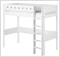 White MDF Hochbett mit Tisch und senkrechter Leiter und farbiger Absturzsicherung.