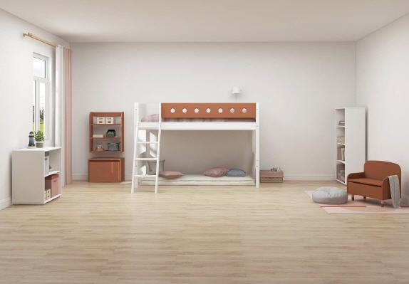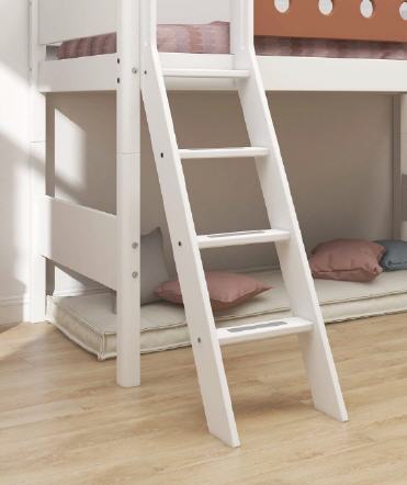 White MDF mittelhohes Bett mit farbiger Absturzsicherung.Pfosten aus Birke.H:143 L:210 W:159 cm